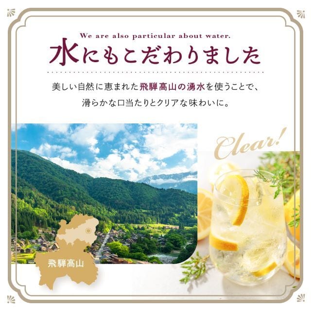 飛騨クラフト独自の「いいとこどり製法」は、果皮の香気成分と果汁・果肉の味わいを別々に抽出し、最後に合わせる手法。香りと余韻のどちらも犠牲にしない、この製法だからこそ生まれる味わいです。ストレート・ロックはもちろん、ソーダ割りやカクテルベースとしての展開にも適しています。